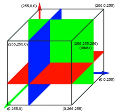 我們可以用一個立方體來表示RGB色彩模型,因為我們剛才說了任意一種色彩都可以被拆分為R、G、B三個分量,同理,立方體中的任意一個點的位置坐標也可以拆分為X、Y、Z三個分量,因此我們就可以利用立方體里面的某個點來表示某種顏色。