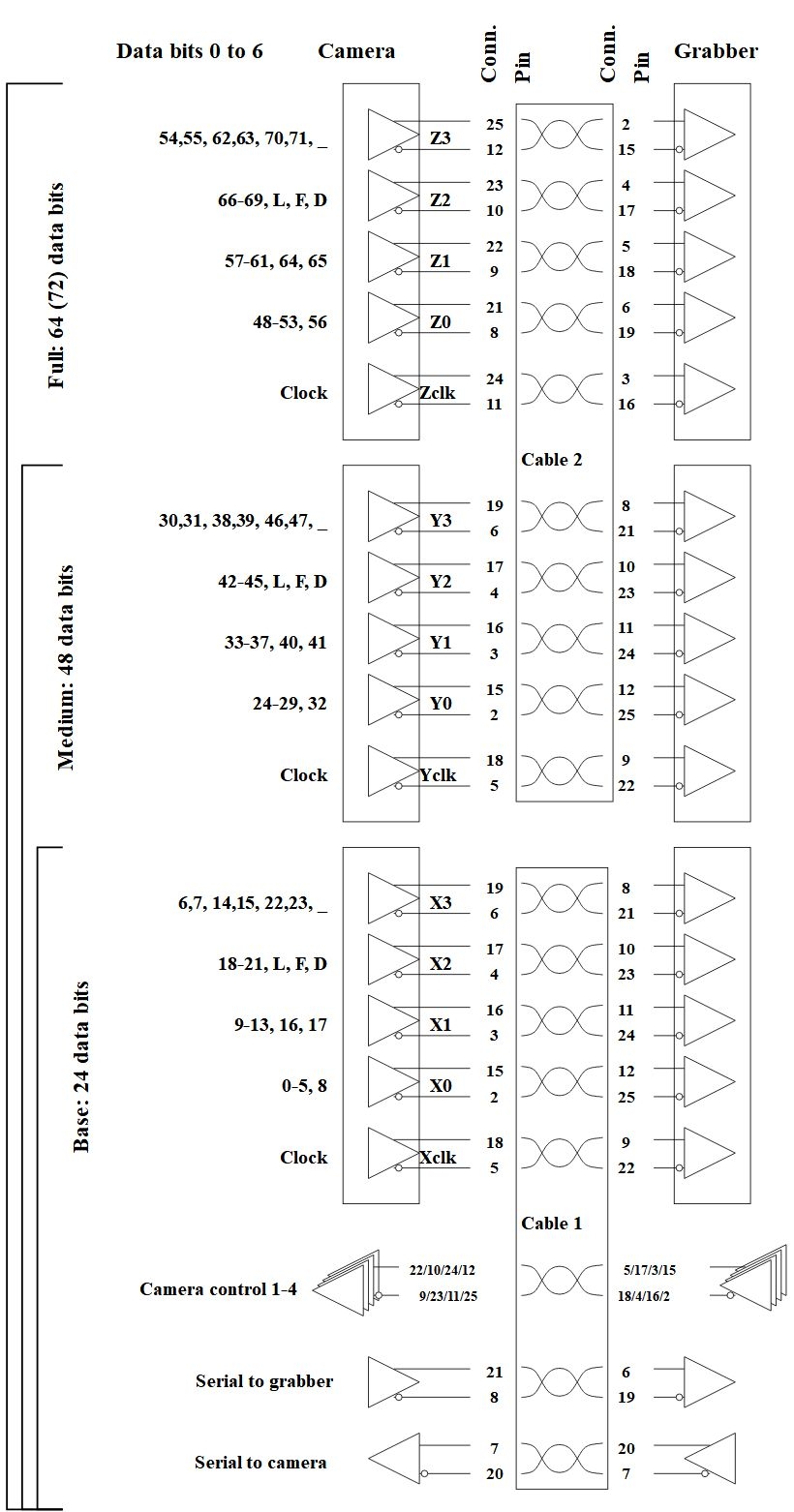 由于單個Camera Link芯片只有28位數(shù)據(jù)可用,為了提高傳輸數(shù)據(jù)的效率,需要幾個Camera Link芯片。按使用要求不同,視頻傳輸模式分為三種配置:Base(基本)配置為一個Camera Link芯片,一根電纜;?Medium(中級)配置為兩個Camera Link芯片,一根電纜;Full(完整)配置為兩個Camera Link芯片,兩根電纜。