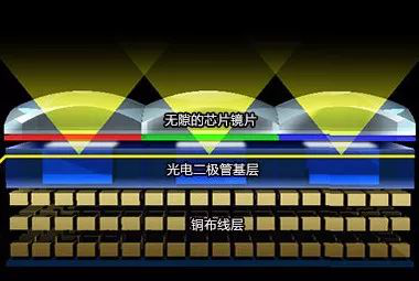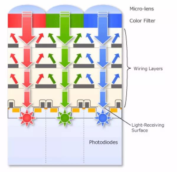 傳統的CMOS “前照式”結構,當光線射入像素,經過了片上透鏡和彩色濾光片后,先通過金屬排線層,最后光線才被光電二極管接收。
